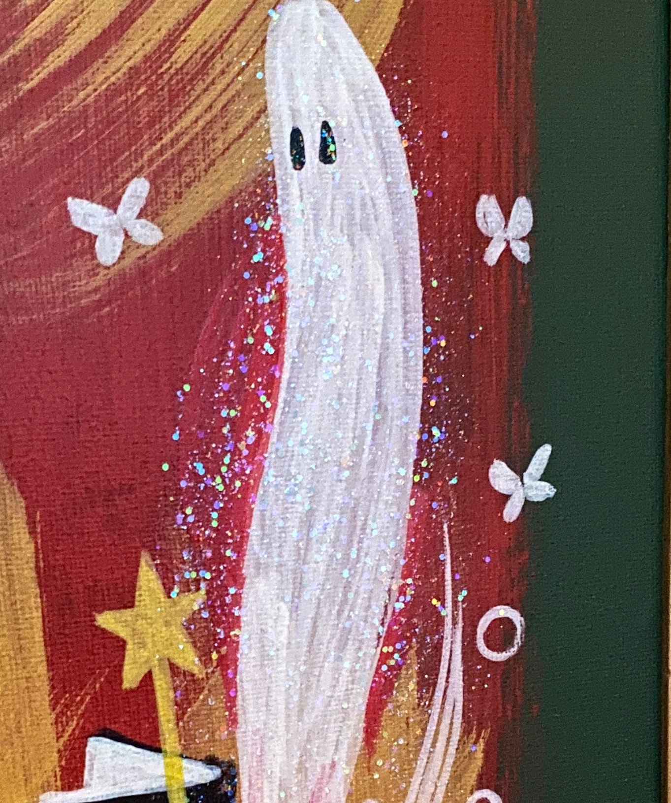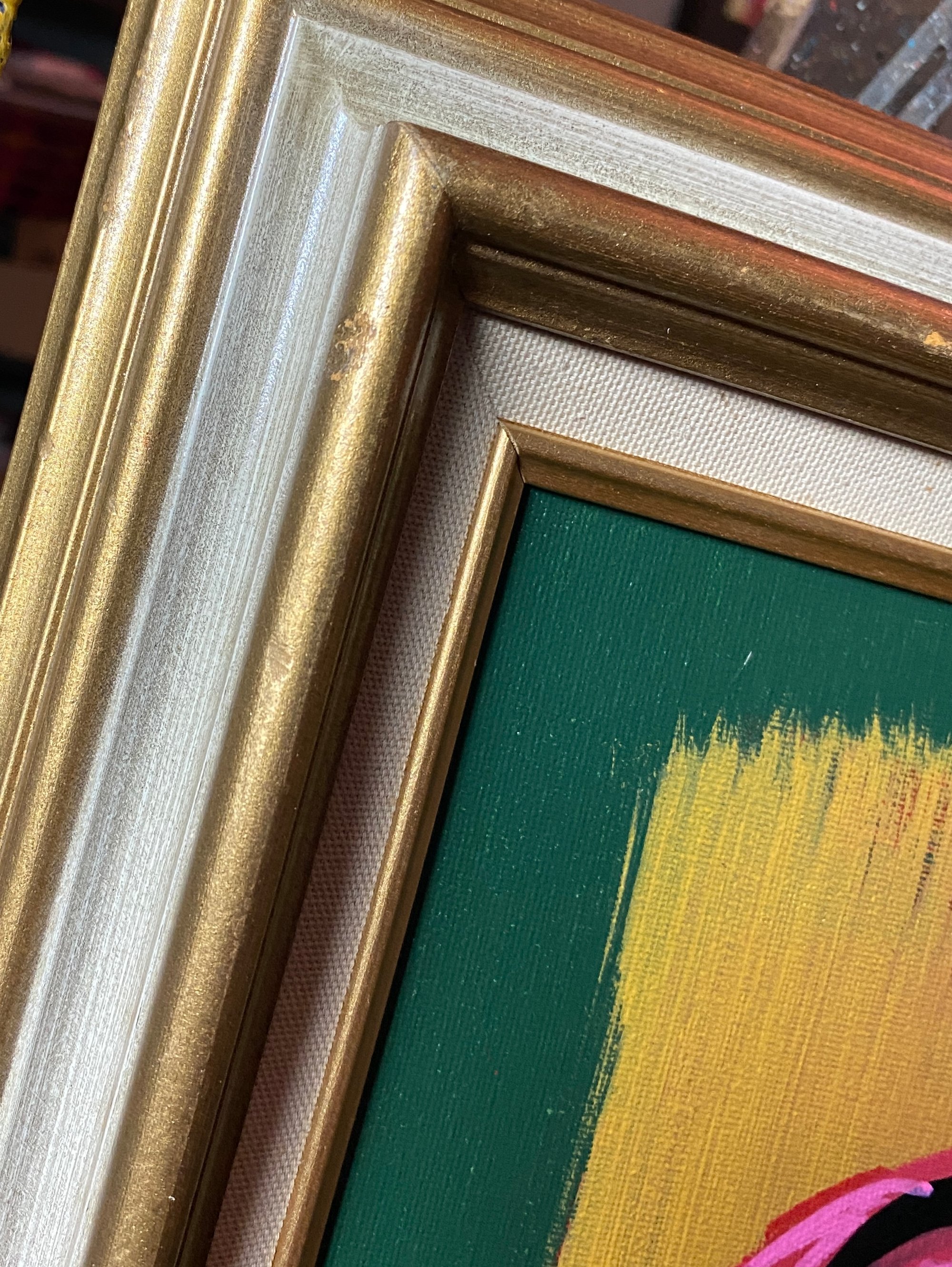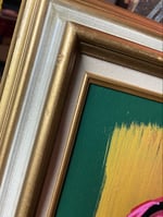 New painting in acrylic, glitter, and acrylic marker on canvas panel. Signed and dated by the artist. Measures 15x18 inches including the vintage hardwood and linen frame. One of a kind. Ready to hang. Third pics shows the cream color of the frame best. The frame does have minor wear that adds to the vintage vibe of the artwork.