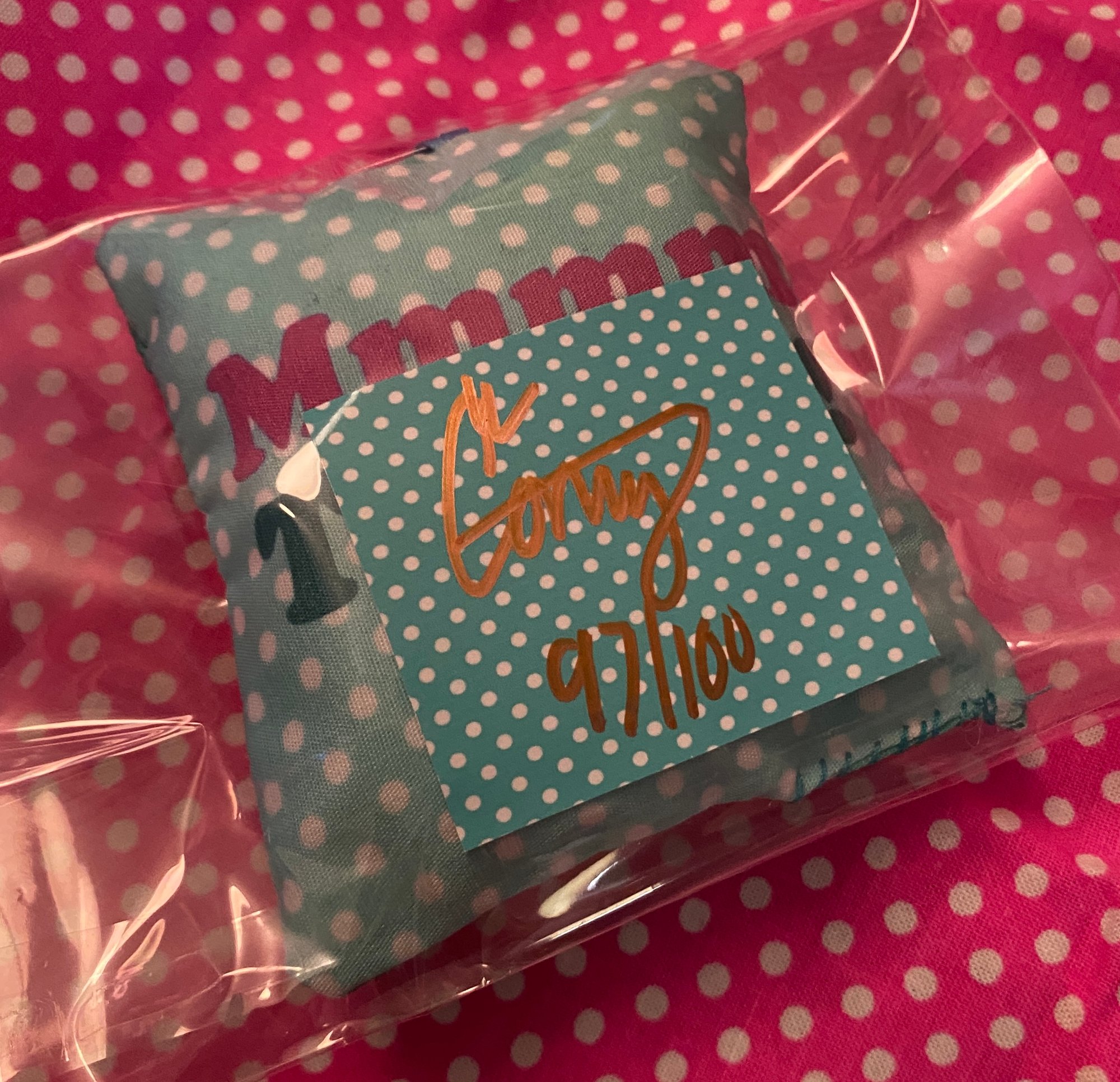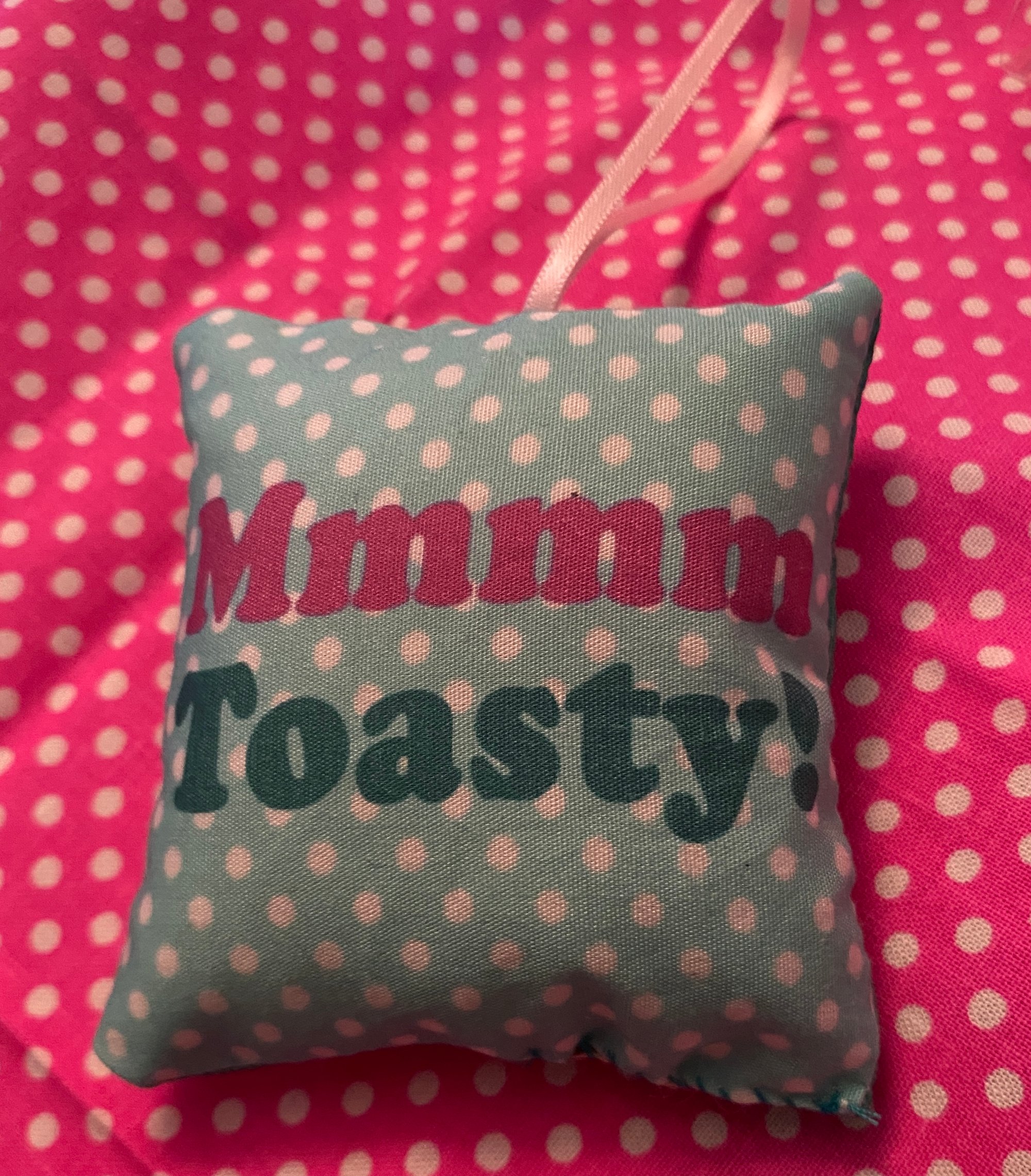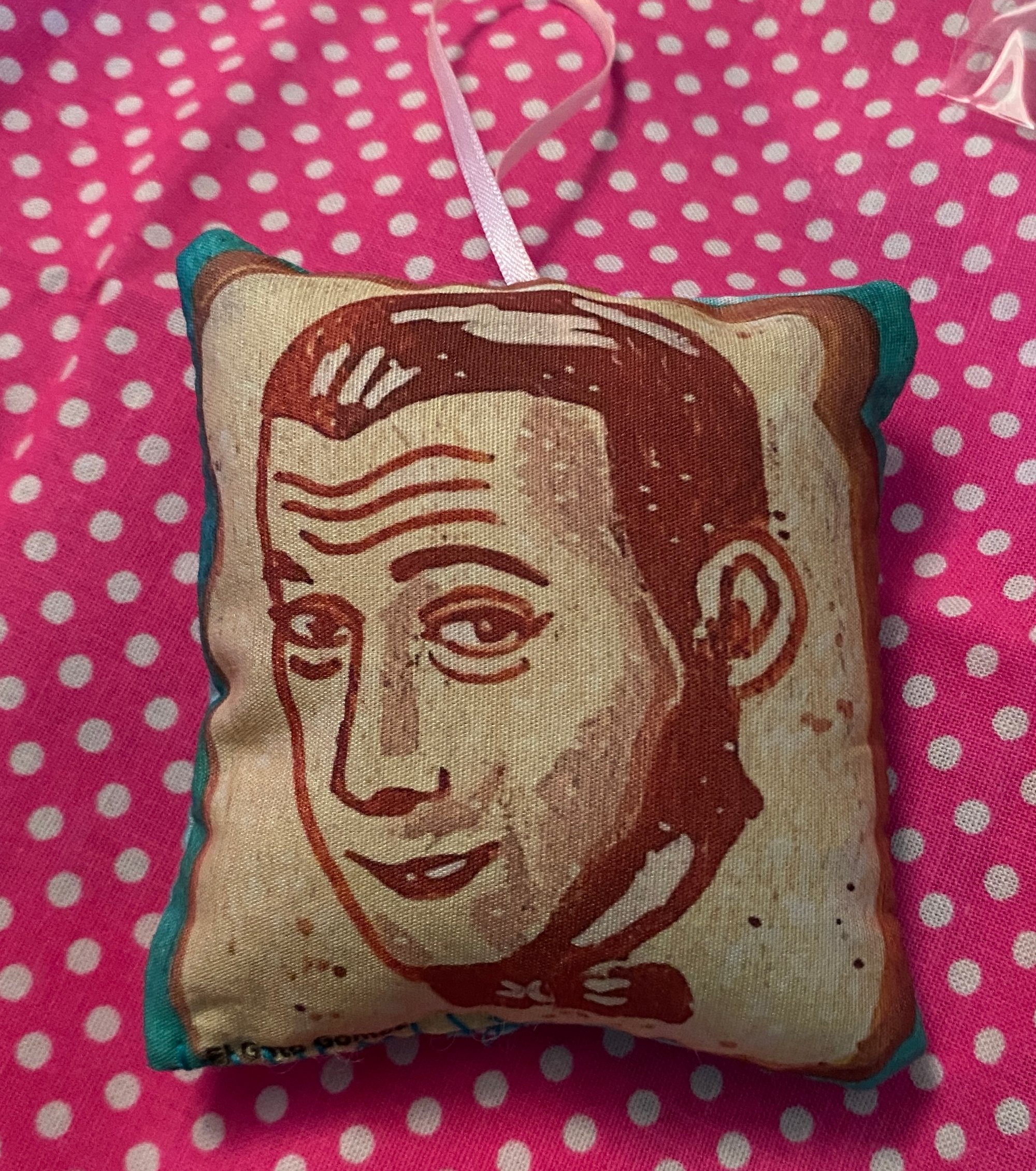 All hand made ornaments! Each measures approximately 3x3 inches . Printed cotton fabric stuffed with poly-fil with satin hanging cords. Signed and numbered on the label. Only 100 sets available.